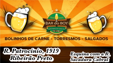 BAR do BOY / Ribeirão Preto SP BOLINHOS DE CARNE – TORRESMOS – SALGADOS CERVEJAS GELADA Facebook: Clique Aqui Rua Patrocínio, 1919 Esquina com a Rua Sacadura Cabral Campos Elíseos CEP 14085-530 Ribeirão Preto – SP