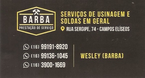 BARBA PRESTAÇÃO DE SERVIÇOS / Ribeirão Preto SP SERVIÇOS DE USINAGEM E SOLDAS EM GERAL WESLEY (BARBA) Rua Sergipe, 74 Bairro Campos Elíseos Telefones Whatsapp: 16 – 99191-8920 16 – 99136-1045 16 – 3900-1669 Instagram = Clique Aqui Ribeirão Preto – SP