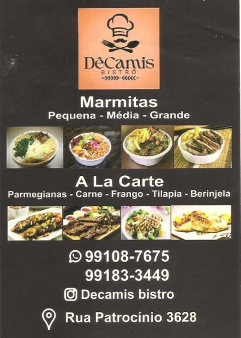 DêCamis BISTRÔ / Ribeirão Preto SP MARMITAS: Pequena | Média | Grande A LA CARTE: Parmegianas | Carne | Frango | Tilápia | Berinjela Telefones 16 – 99183-3449 Whatsapp 16 – 99108-7675 Instagram = Clique Aqui Rua Patrocínio, 3628 CEP 14090-310 Ribeirão Preto SP
