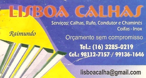 LISBOA CALHAS / Ribeirão Preto SP Raimundo SERVIÇOS: Calhas | Rufos | Condutores e Chaminés Coifas | Inox Orçamento sem Compromisso lisboacalha@gmail.com Telefones: 16 – 3285-0219 | 16 – 98112-7157 Whatsapp 16 – 99136-1646 Ribeirão Preto SP