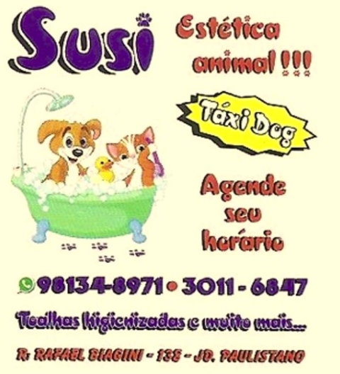 SUSI ESTÉTICA ANIMAL / Ribeirão Preto SP Banho * Tosa Higiênica Tosa da Raça * Hidratação Taxi Dog Instagram = Clique Aqui Facebook = Clique Aqui Telefones: 16 – 3011-6847 e Whatsapp 16 98134-8971 Rua Rafael Biagini, 138 Jardim Paulistano CEP 14090-328 Ribeirão Preto – SP